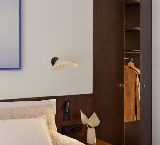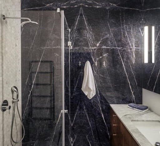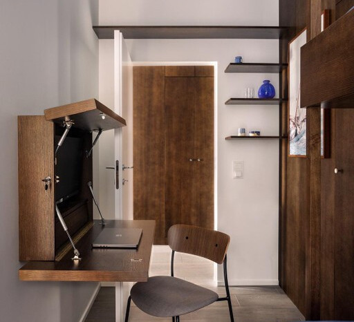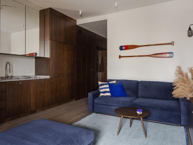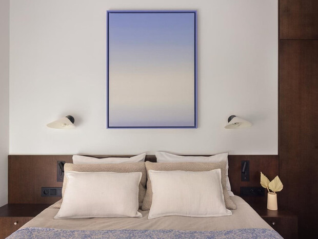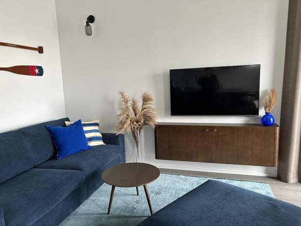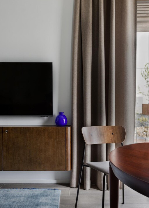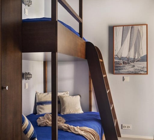 Modern waterfront complex with white villas and private berths, marina with yachts, sea and forest views, sunlit terraces.